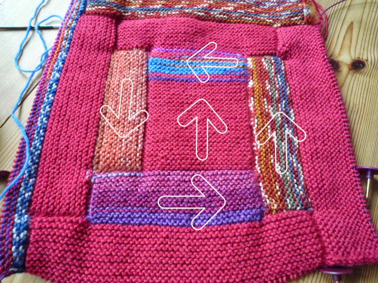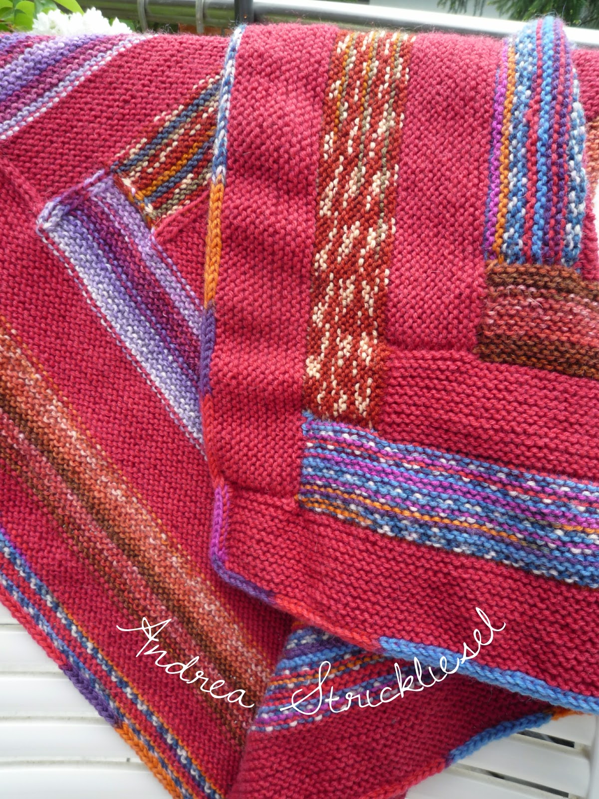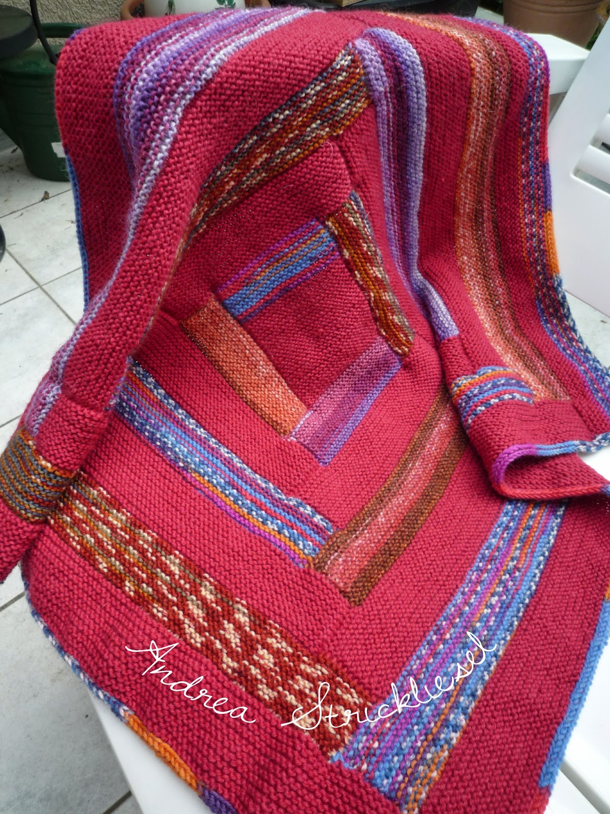 Für mich selber nicht mehr, aber für eine liebe Freundin habe ich meine 6 fädige Sockenwolle zu einer Babydecke verstrickt. Grundfarbe ist ein Himbeerton, rundherum die „Reste“ die ich noch hatte. Begonnen habe ich in der Mitte und habe dann an die linke Seite die nächste Kante angestrickt.