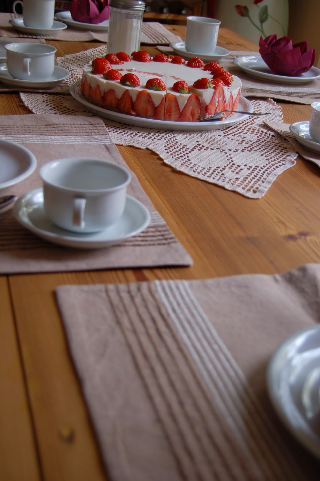 der gedeckte Tisch, das einfache Geschirr mit den super gefalteten Servietten perfekt in Szene gesetzt, das herrliche Häkeldeckchen, welches mein Adlerauge gleich entdeckte 🙂 und den leeeeeckeren Erdbeerkuchen.