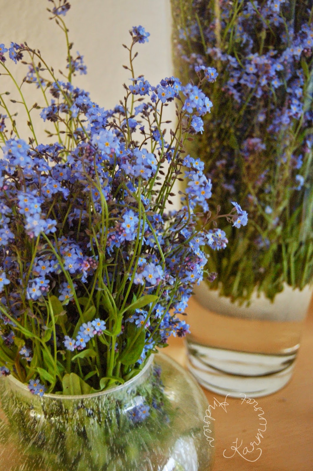 Vergissmeinnicht mag ich sehr gerne und habe dieses Jahr auch ganz viele im Garten…sie wachsen sogar dort, wo sie nicht wachsen sollten – auf den Kieswegen und einfach überall…Ich bringe es nicht übers Herz sie auszureissen…oh o. In deinen Vasen machen sie sich aber auch sehr gut.