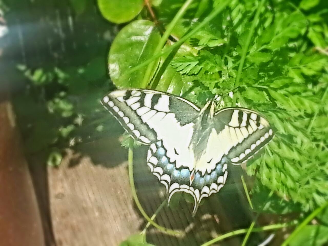 Diese Schönheit, steuert meine Freundin bei. Sie hatte vor einiger Zeit eine verpuppte Raupe gefunden, hat sie in einen Blumentopf abgelegt und gestern ist dieser riesige Schmetterling auf ihrem Dachgarten herumgeflattert. Ich bin sicher in diesem Paradies findet der auch die richtige Nahrung. Ich hab mal nachgeschaut, das ist ein Schwalbenschwanz und lebt auf verschiedenen Doldengewächsen… Na dann Freundin, ich hoffe er findet einen passenden Partner ☺