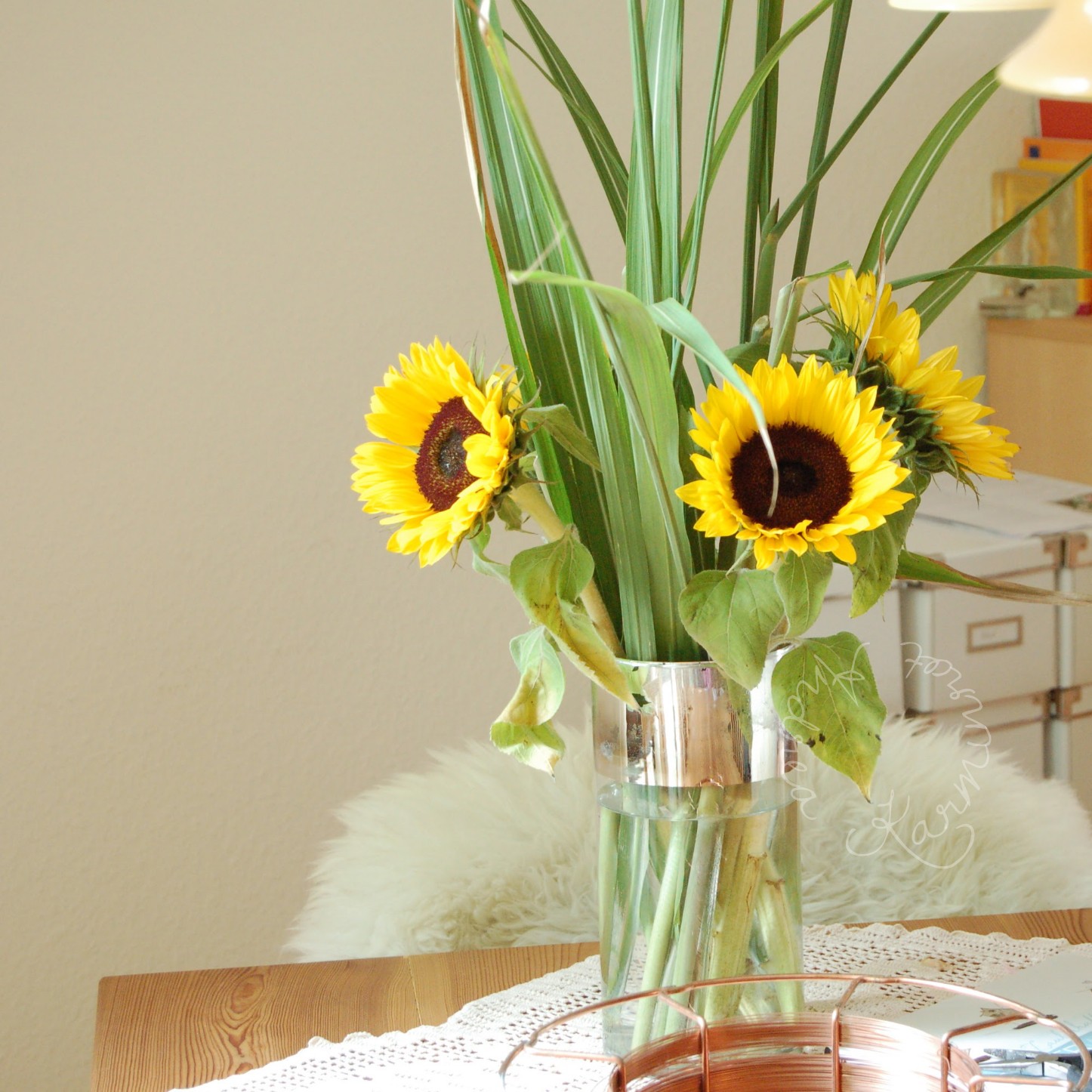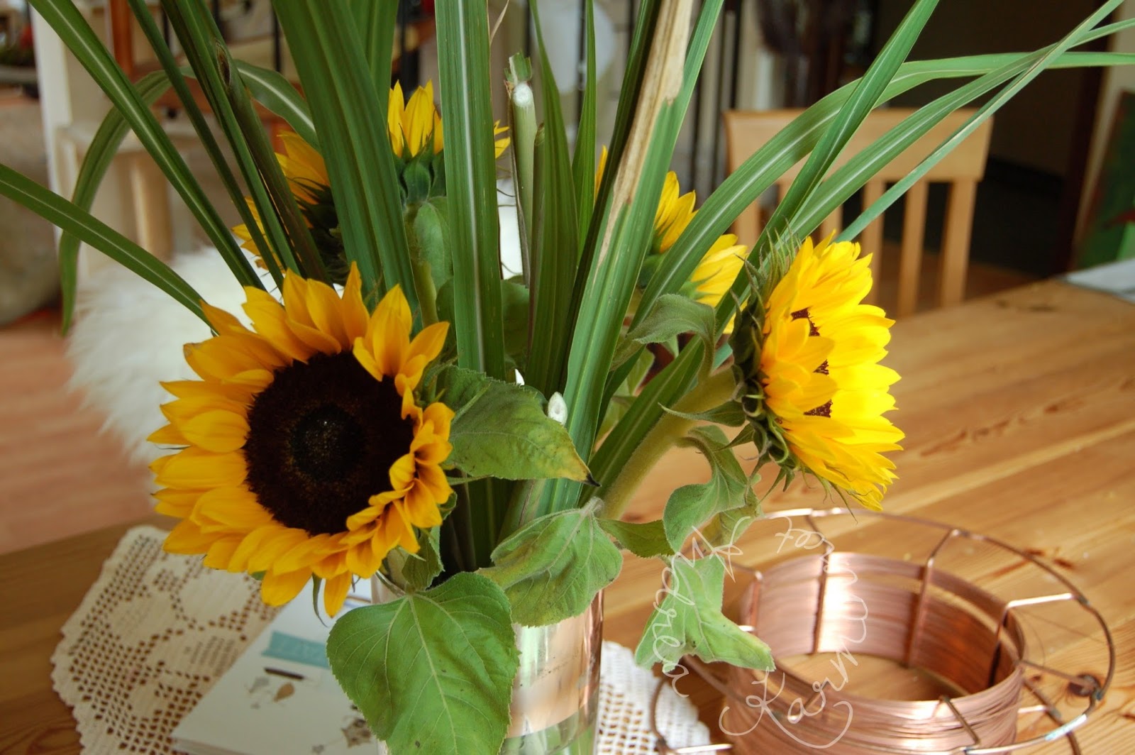 Meine Sonnenblumen haben wieder Platz in meiner Lieblingsvase gefunden. Ein bisschen Grün, Schilfgras aus dem Garten der Nachbarin. Auf meinem Tisch liegt noch der Kupferdraht, mit dem ich „zauberhafte Papierkunst“ herstellen möchte. Das Buch habe ich gerade erst von Kirsten gewonnen.