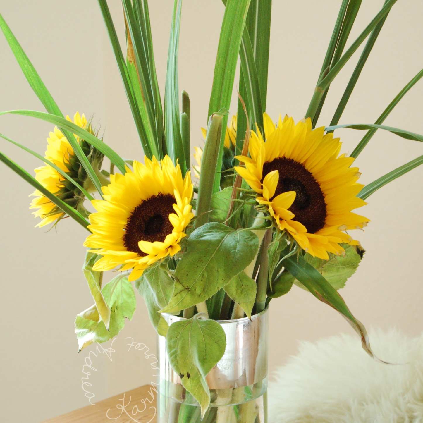 Ich mag an deinem Strauß, dass die Sonnenblumen so kurz geschnitten sind und das Gras so hoch über sie aufragt. Schön!