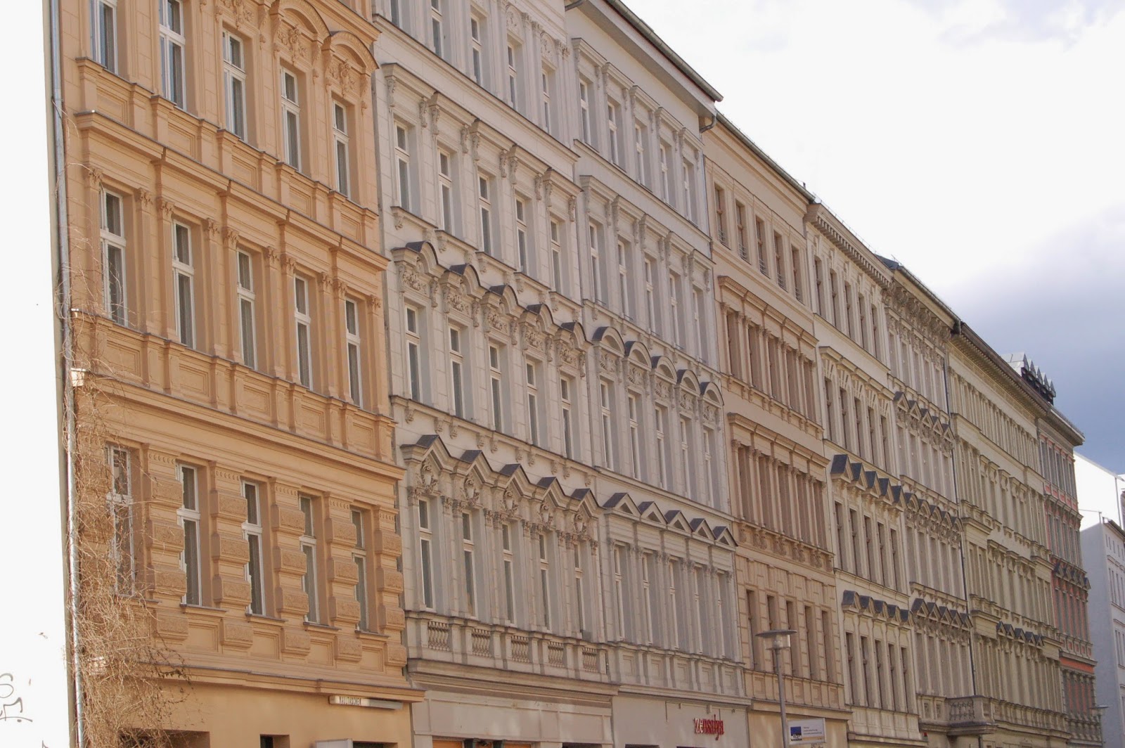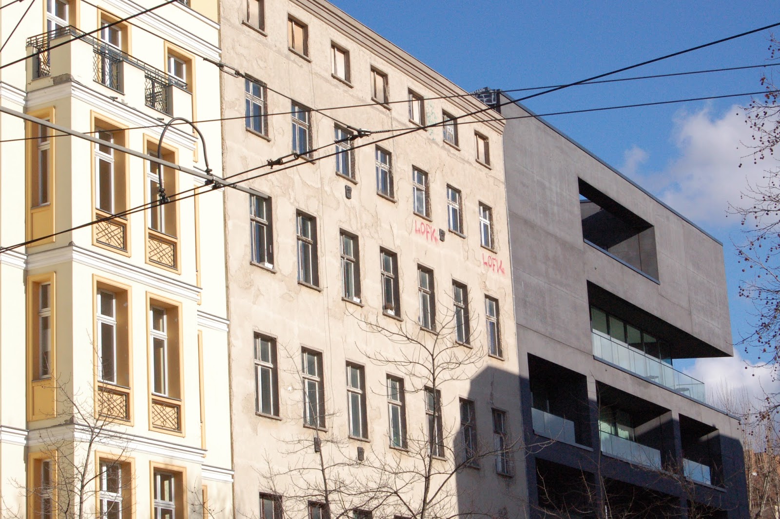 Das ist auch eine interessante Kombination. Nach dem letzten Krieg, hat man in Berlin kurzerhand die Stuckelemente abgeklopft. Kurzfristig diese wieder herzustellen, war zu aufwendig, weshalb sie dem Hammer zum Opfer fielen. Schade,… aber einige Häuser werden nach alten Mustern wieder hergestellt. Links schon wieder mit Stuck, Mitte schlicht ohne alles, außer Graffiti und Rechts extra modern.