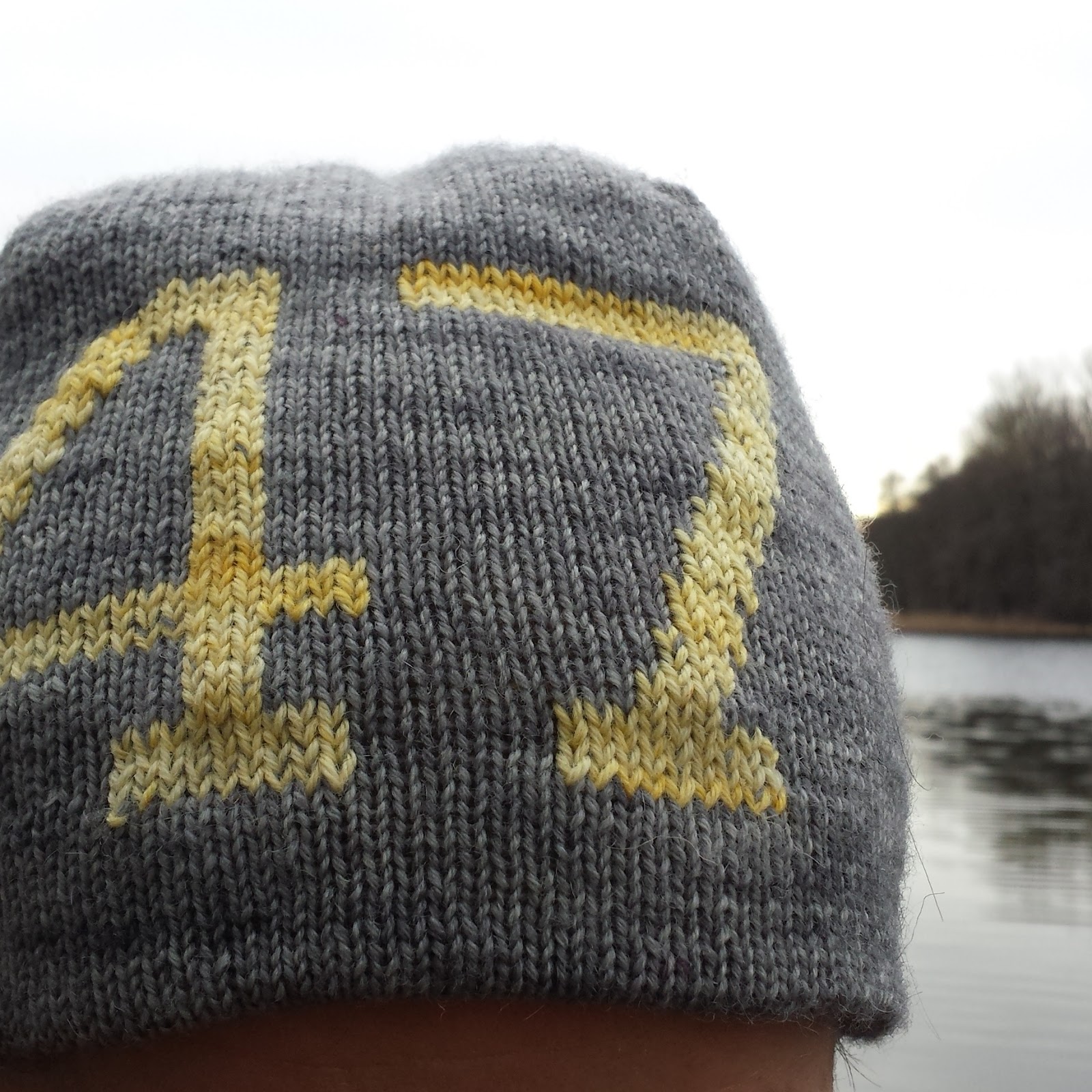 Die 47 wird dann einfach im Maschenstich aufgestickt. Dazu gibt es bei YouTube super Videos. Damit ich mir das Malen einer Vorlage schenken kann, habe ich mir die Ziffern mit Kreide auf die Mütze gemalt. Das hat super geklappt. Gestrickt ist sie übrigens mit 3er Nadeln und Sockenwolle aus meinem neu entdeckten Wollladen „Die Wollnerin„. Die Besitzerin färbt auch nach Kundenwünschen. Dort habe ich die neue Wolle schon bestellt.