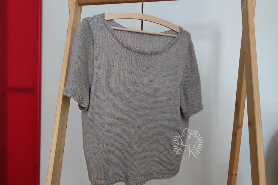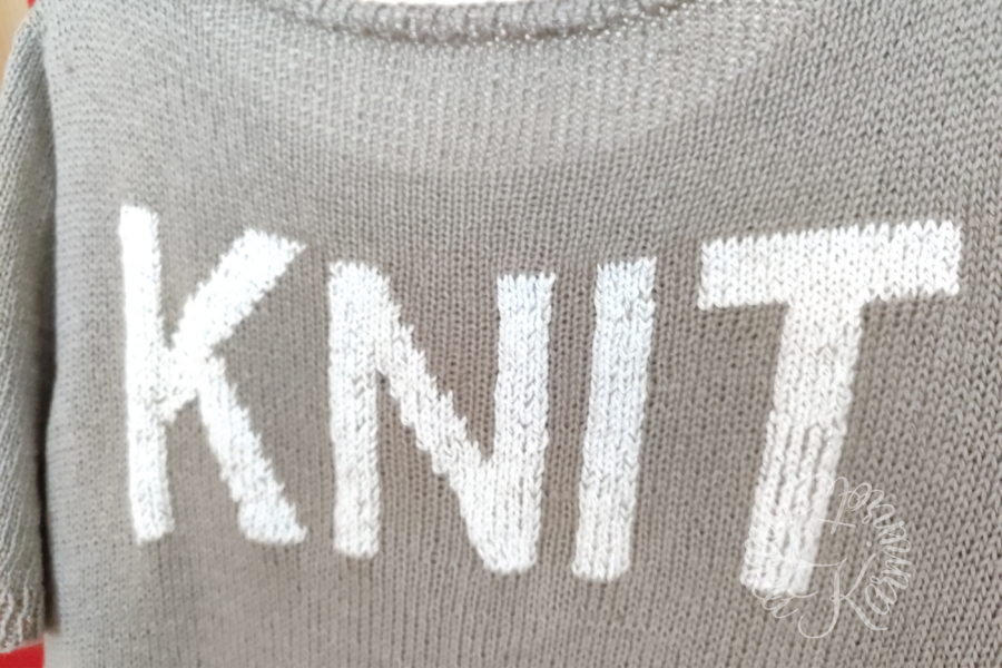 Der eigentliche Eyecatcher ist der Schriftzug auf dem Rücken. Der wird im Nachhinein im Maschenstich aufgestickt. Ich habe dafür ein glitzerweißes Baumwollgarn benutzt. Und ich habe während des sticken so gedacht, dass diese Stickerei bald länger dauert, als das ganze Shirt zu stricken. Ich hatte eigentlich zu wenig Möglichkeiten, das Shirt in diesem Sommer zu tragen. Obwohl das Garn sich wirklich gut anfühlt. Es ist ganz leicht und angenehm, kühlt fast ein bisschen. Ich freue mich auf den nächsten Sommer oder ich trage es mit einem langärmeligen Shirt darunter. Wie auch immer. Ich habe wieder ein paar Knäule verarbeitet und habe ein hübsches Shirt im Schrank.
