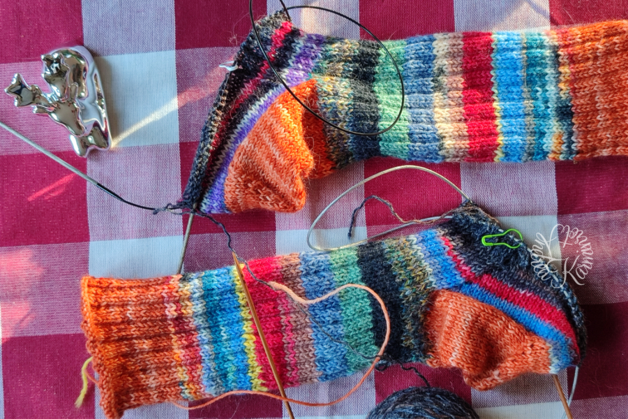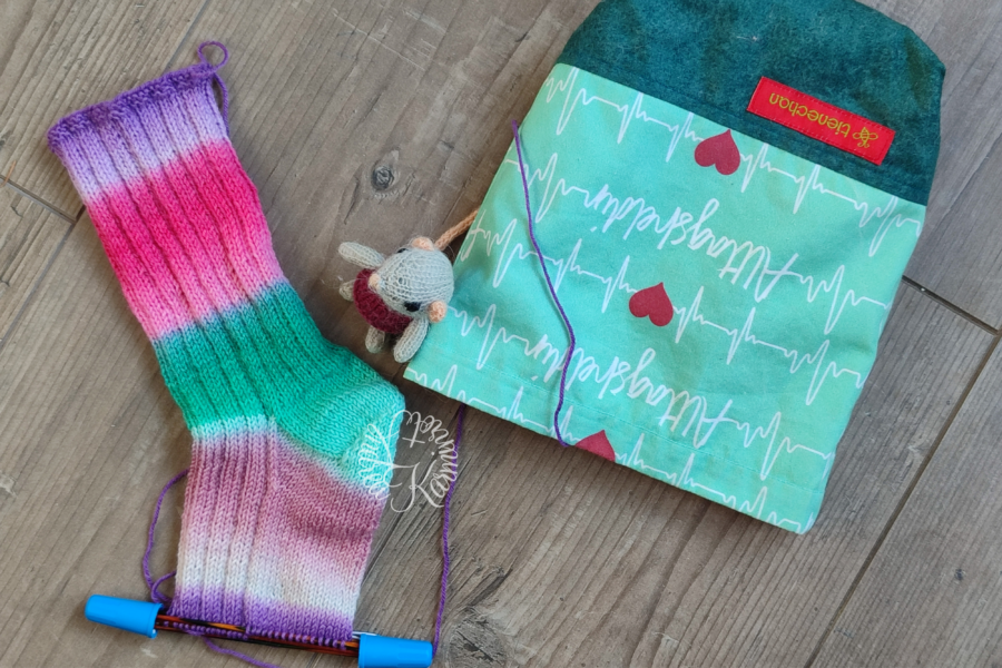 Was habe ich noch? Noch ein Paar Socken. Die stricke ich für das Monstermädchen. Sie hat mir gerade erst ihre löchrigen Socken vorbeigebracht, damit ich sie retten kann. Das werde ich auch, wenn ich einen Moment der Ruhe finde. Hast du schon mal eine Herzchenferse gestrickt? Ich nicht. Deshalb musste ich das nun auch endlich mal probieren. Das wird nicht meine Lieblingsferse. Kann man mal machen, aber ich nicht immer! Dafür ist das Garn der Knaller, oder?