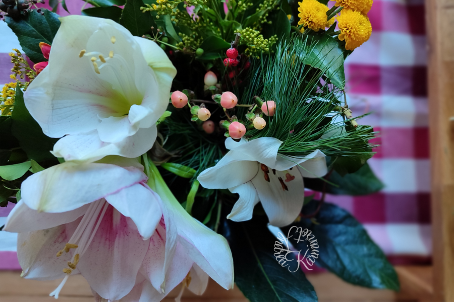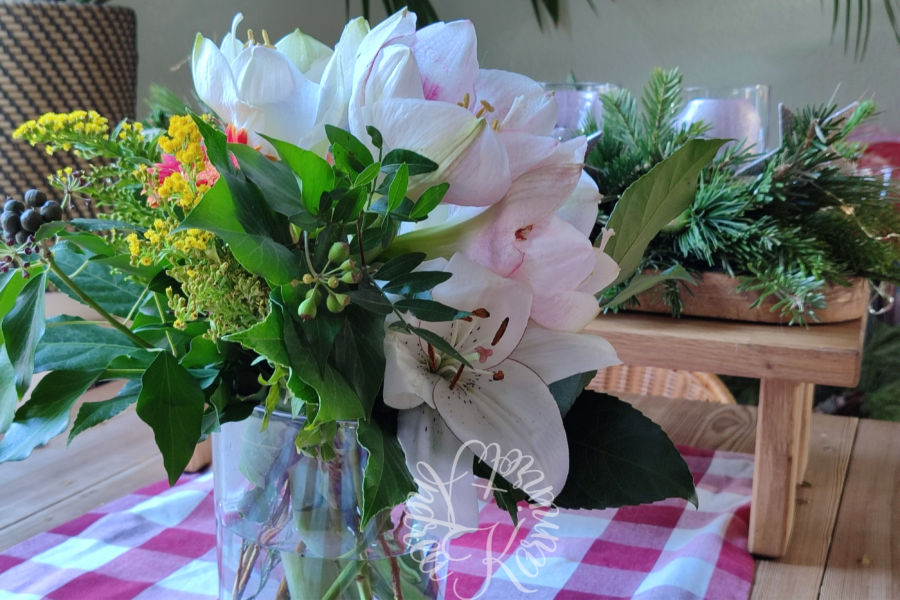 Der Strauß war mal sehr viel größer. Ich weiß nicht wie man das nennt, aber die Blumen waren nach der großen Amaryllis sortiert und die kleineren drumherum. Ich mag aber lieber kleinere runde Sträuße und als sich die Blüten nicht mehr so gut gehalten haben, habe ich den Strauß neu sortiert und alles gekürzt.