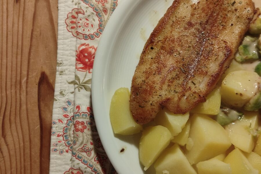 Der Kerl hilft mit und so ist das Essen schnell fertig. Bouletten für den Kerl. Fisch für mich mit Rosenkohl.